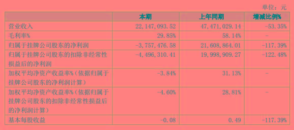 挖貝網 8月19日消息,恒豐能環(872876)近日發布2020年半年度報告,2020年上半年公司實現營業收入22,147,093.52元,同比減少53.35%;實現歸屬于掛牌公司股東的凈利潤-3,757,476.58元,同比由盈轉虧。